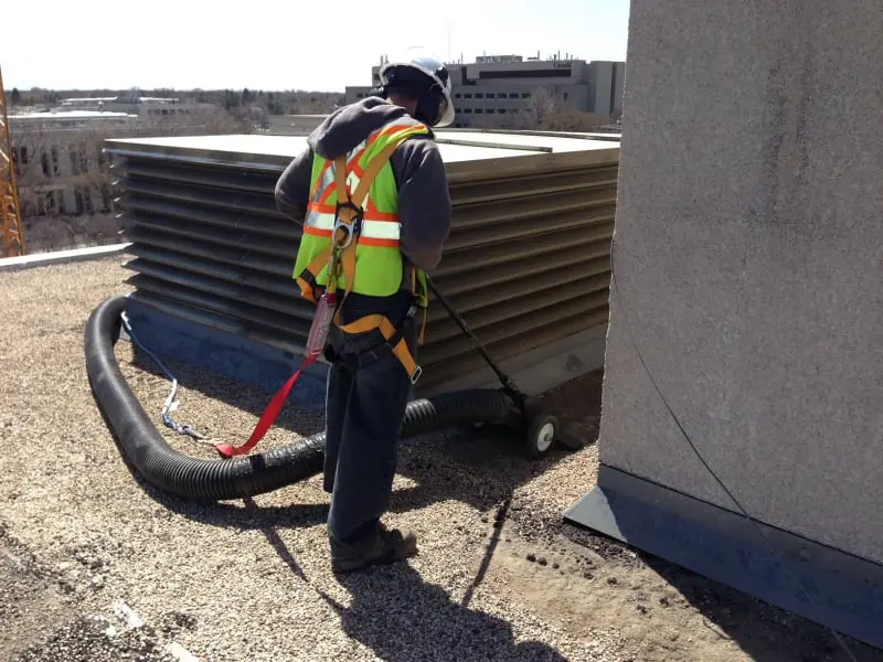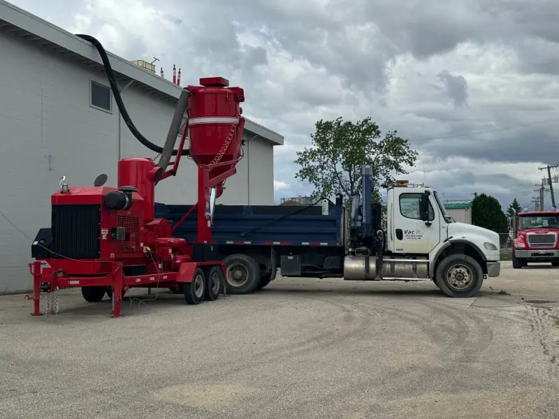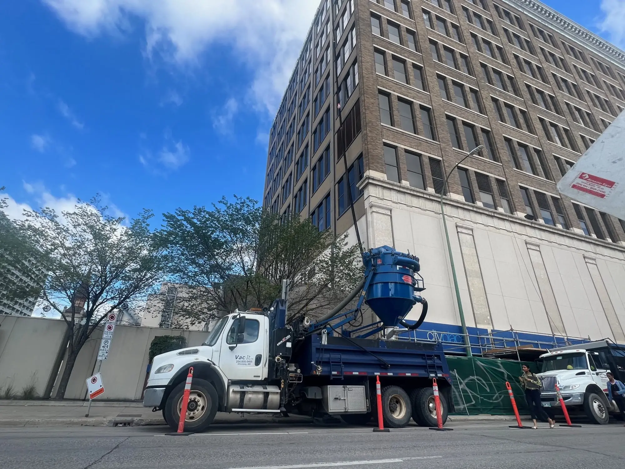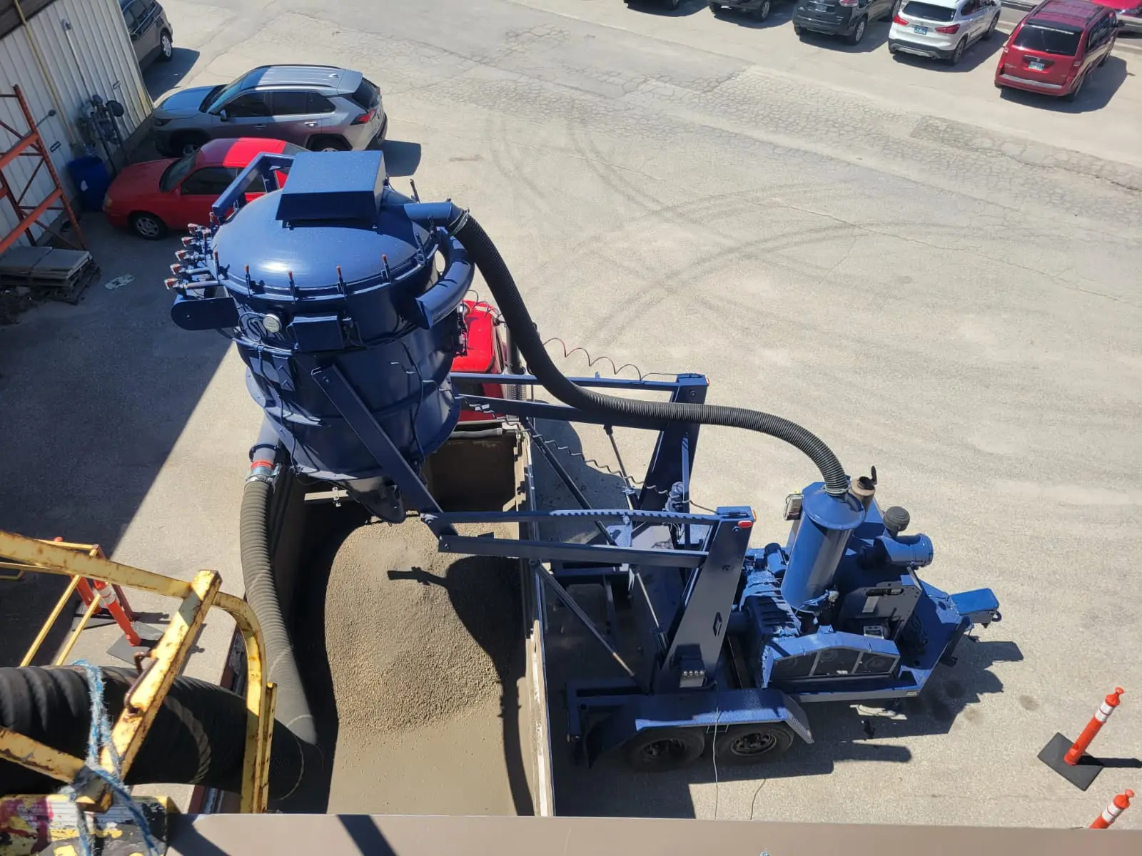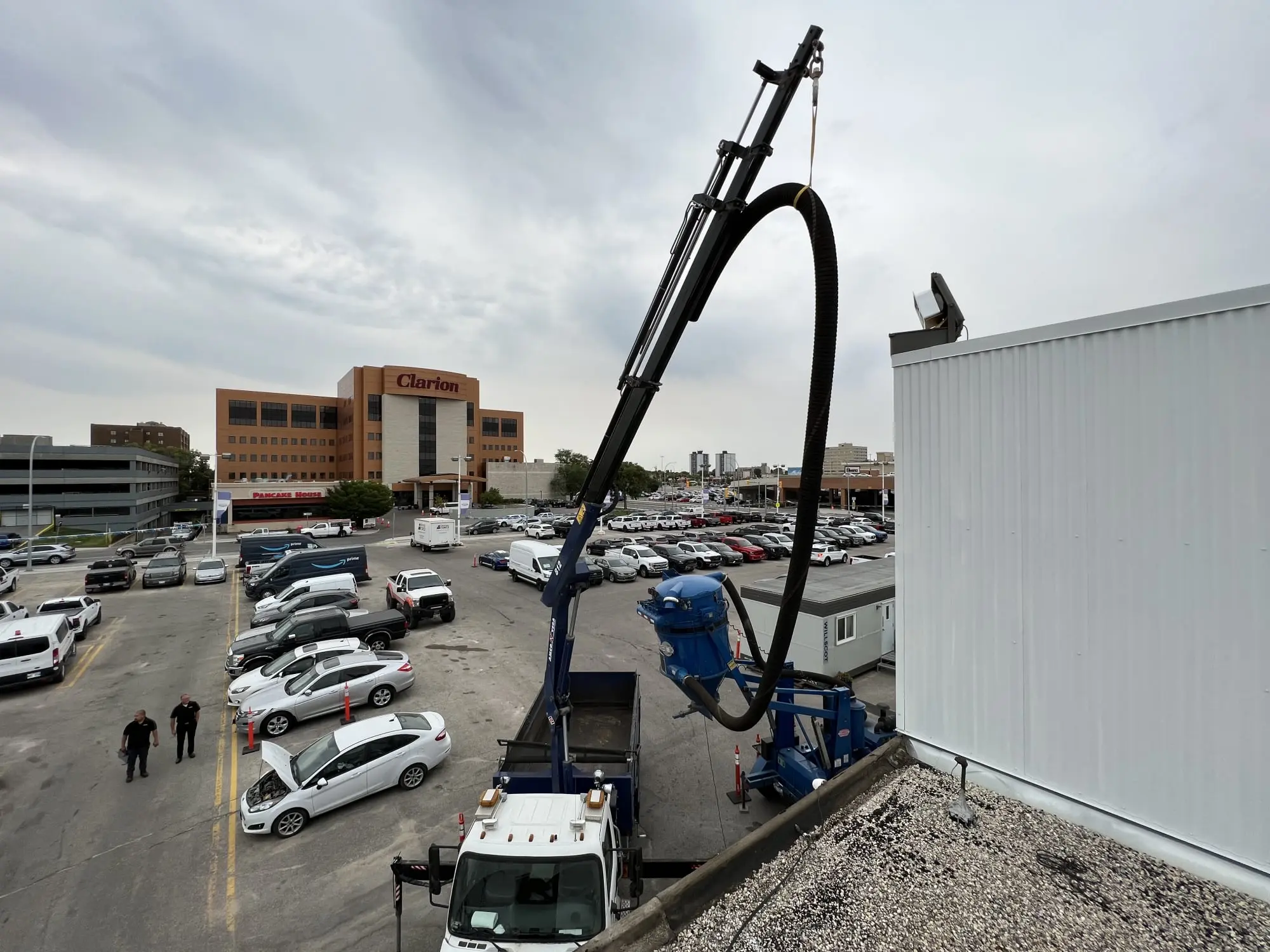 Our vacuum trailer and dump truck is set up next to the building using a combination of hose and pipe. We then make a single pass to remove all loose and non-embedded rock from the roof surface. Our machines can vacuum all types of roofing aggregates from pea gravel to 4” river stone. With multiple vacuum sizes we can vacuum from 1200 ft or as high as 20 plus stories.