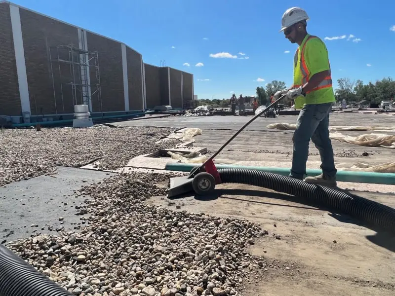 Save time & money, just a phone call and your rock can be vacuumed. Your employees are available to continue working on other portions of the project rather than shoveling aggregates. This helps you get your project completed quicker, especially important in short summer roofing seasons.